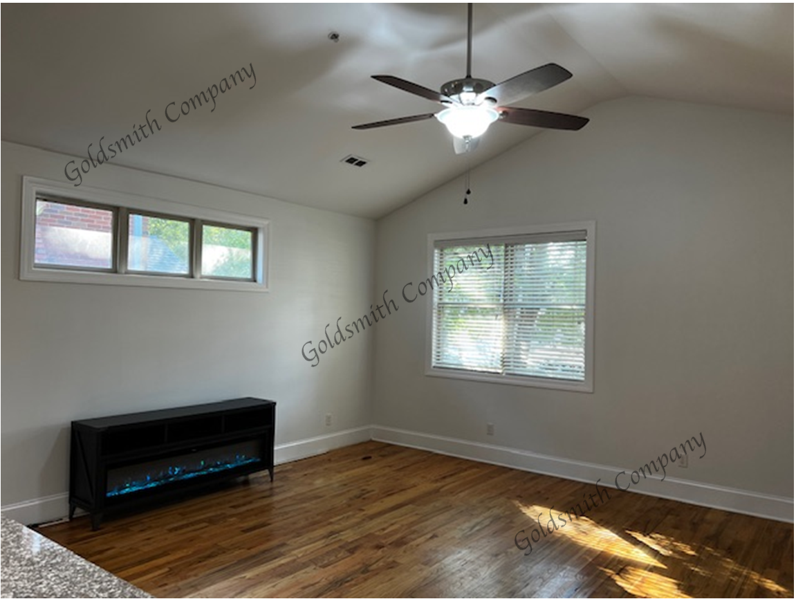 Top level with vaulted ceilings, hardwood floors, electric fireplace